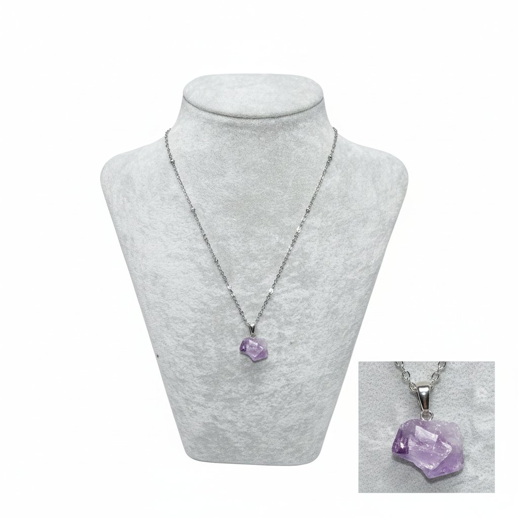 Fio em aço inoxidável com ponta de ametista natural, simples e elegante. Uma peça pensada para cura, meditação e intuição, ideal para quem procura ligação a energias mais elevadas no dia a dia.